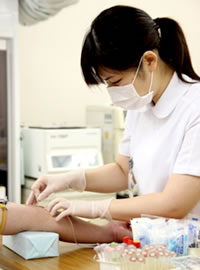 外来での採血は、検体採取後の適切な検体処理・迅速な結果報告のために、主として採血室で検査技師が行っています。検査室では、血液検査の一部と尿検査などの緊急検査を実施しています。